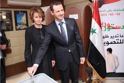投票するアサド大統領(後ろはアスマー・アサド夫人)