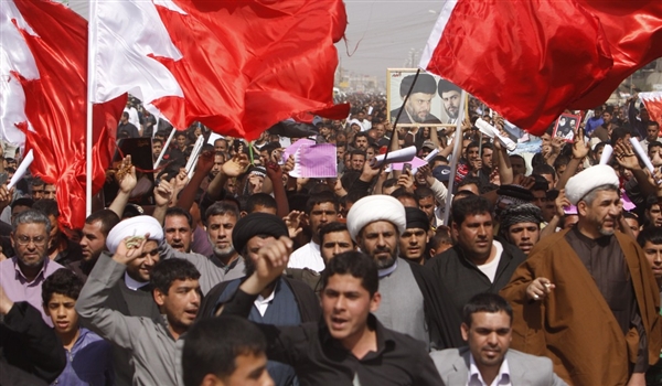 イラクのバスラでバーレーンの抗議運動を支持するデモをするサドル師の信奉者ら