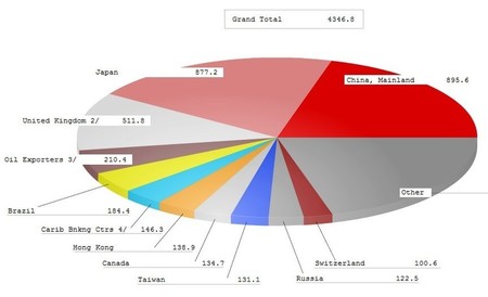 米国債保有国(上の大きな二つの扇型部分が日本と中国)