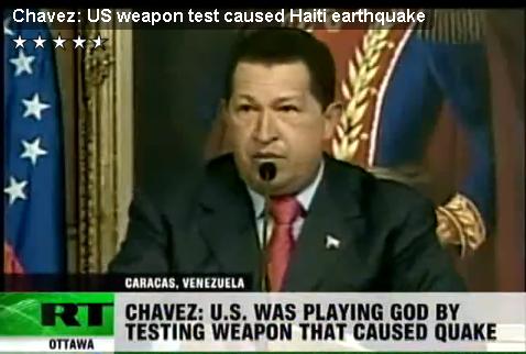 ロシア・トゥデイによれば、チャべス大統領の国営テレビViVe TV はアメリカが環境的破壊をもたらす地殻変動兵器のテストの一環としてマグニチュード7の地震をハイチに起こしたと非難していると伝えるメディアの報道があるという。