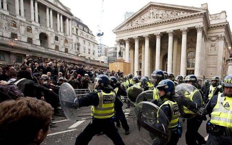 G20時にイングランド銀行前でぶつかる起動隊とデモ隊