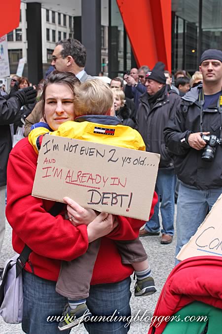 このお母さんは、息子の背中に、「僕はまだ2歳にもならないのに、もう負債者なんだ」と書かれたプラカードを当てている。