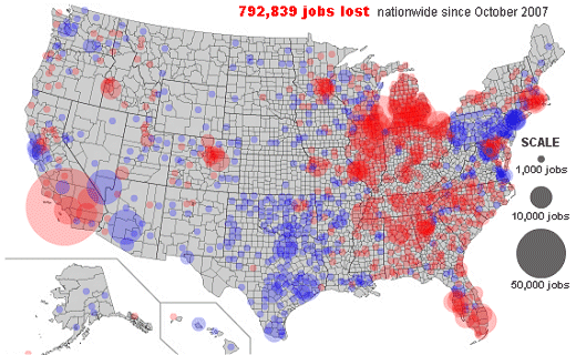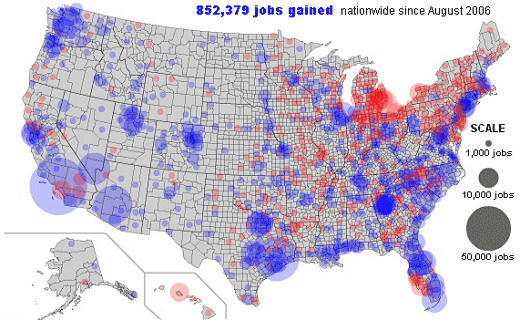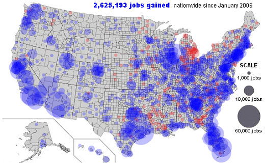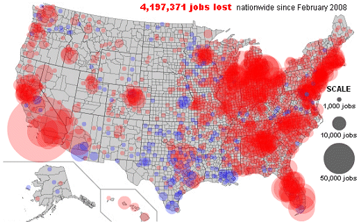 おおもとの記事は【Slate Magazine:When Did Your County's Jobs Disappear?(あなたの地域でどれくらいの職が失われた?)】。アメリカの公務データ【Local Area Unemployment Statistics】を元に、各郡(州のひとつ下の行政区分)別における雇用数推移をインタラクティブ・マップ化したものが掲載されている。対象期間は2007年1月から2009年2月で1か月単位。前年同月比における雇用数の推移を表しており、雇用が増えていれば青・減っていれば赤の円が描かれる。そして円の大きさはそれぞれの絶対値を示す。例えば赤い大きな円なら「前年同月と比べて大きく雇用が失われた(働いている人が減った=雇用機会が失われている)」、青い大きな円なら「雇用が大幅に増加した(働いている人が増えた=雇用機会が増加している)」ことを意味する。