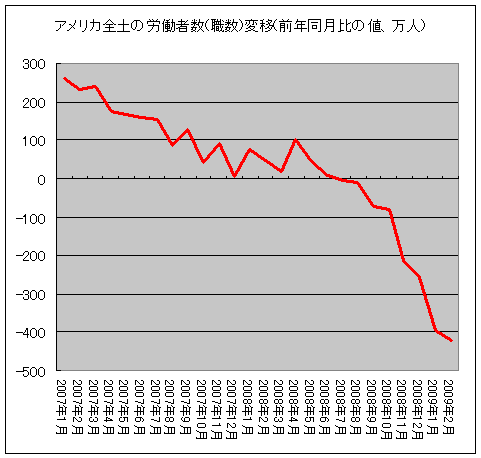 全米での雇用者数の増減を示す図とグラフを見ると、今後アメリカはどこまで落ちるのか、誰でも不安な面持ちにならざるを得ないであろう。